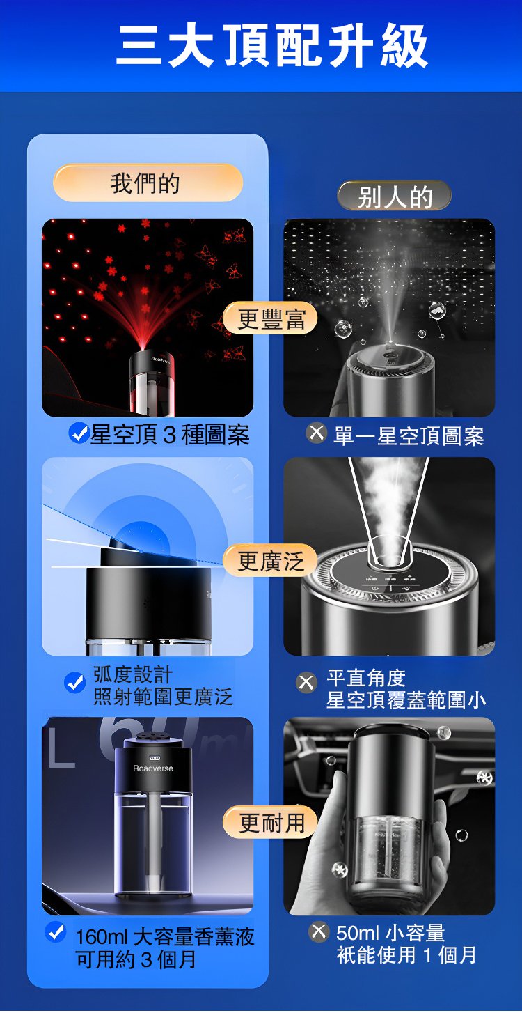 20分鐘前星空頂高顏值車載香薰氛圍燈!給您美妙體驗! 祛除異味 持久留香 植物萃取 安全放心 孕嬰可用,家用,辦公室用,車用都可以 - 超夯鉅惠:買三送三(單瓶160ML)-NT$ 1588